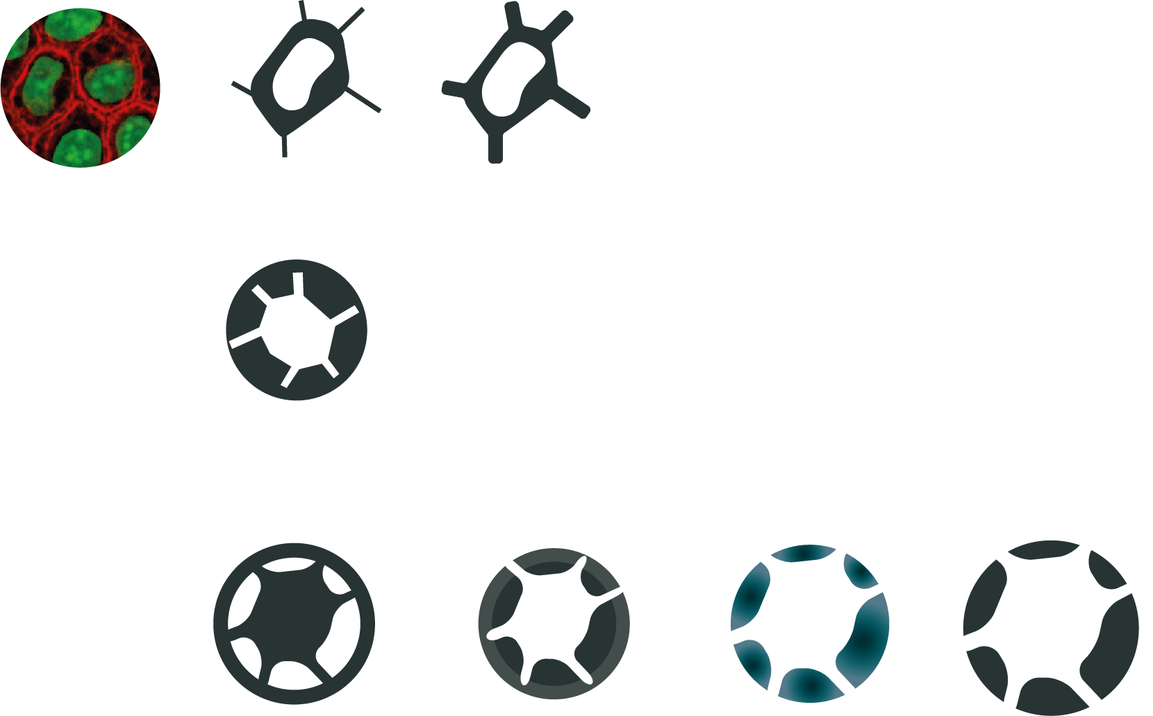 Célula. Conexión. Transformación. El símbolo condensa estos conceptos fundamentales en un diseño minimalista y esquemático. Ideado para cubrir la representación gráfica del instituto en cualquier soporte/sistema y darle una imagen dinámica e integradora.